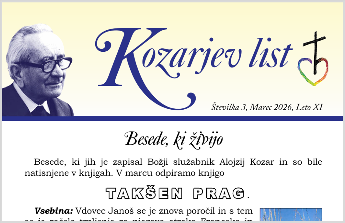 Izšla je 3. številka Kozarjevega lista. Vabi nas, da vzamemo v roke knjigo Takšen prag in se okrepimo z besedami, ki jih je zapisal Božji služabnik Alojzij Kozar. Spomni nas tudi na dogodke, ki so se zgodili v minulem mesecu in na dogodke, ki so pred nami.